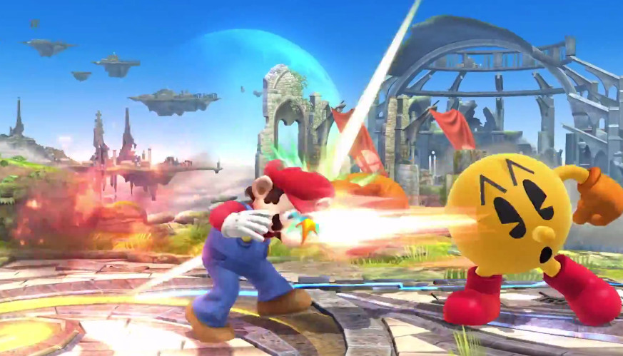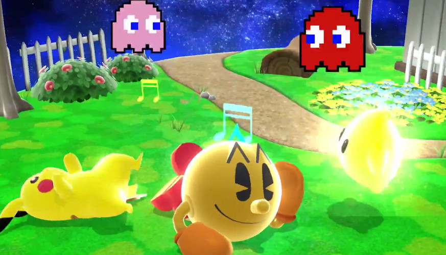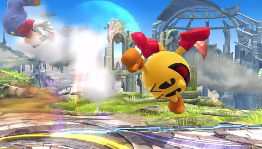 Pac-Man’s taunts are a callback to retro Namco games such as Galaga, Dig-Dug, and Xevious. Charge up his Bonus Fruit move to scroll through the classic bonus items. Each item has a different effect when thrown. Create a trail of pellets with Power Pellet by holding the Special Attack button and directing with the Control Stick, then release to gobble away. Bring out the Fire Hydrant to repel enemies with water, or kick it away to deal damage. For his Final Smash, Super Pac-Man, he eats a Power Pellet and Super Pellet to transform into a giant 2-D version of himself, moving in four possible directions as controlled by the player to gobble up enemies.