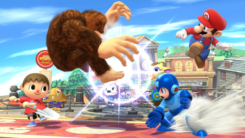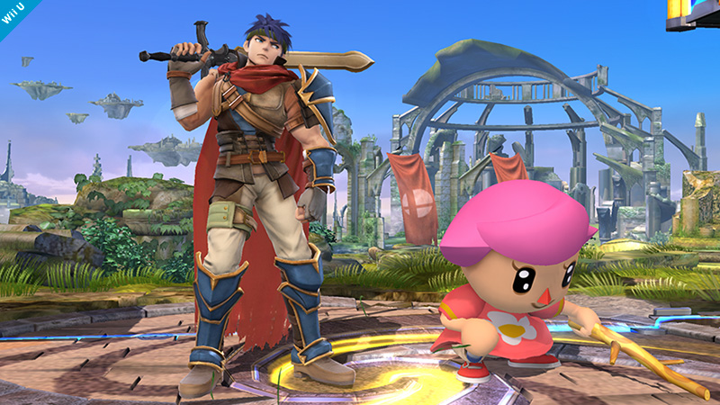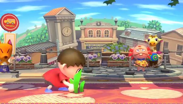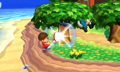 Ride on top of the Lloid Rocket by holding the Special Attack button instead of simply pressing it. Use the Down Special to plant a sapling, then again to water it with a can, then again to use an axe to chop it down. After planting a sapling, the watering can may be used to push foes away, and the axe may be used to attack players. Here's Villager! Bury opponents into the the ground with his trusty shovel by using his Down Smash. You can play the male or female Villager. Each alternate is based on default face variations of Villagers in the Animal Crossing series.