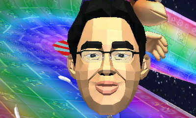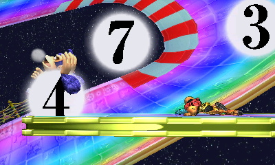 In Smash Bros., Dr. Kawashima’s polygonal face (which also appears in Brain Age) floats in the background, tossing number bubbles about the stage. If the numbers collide and equal 10, they will cause a huge explosion. Fighters can attack the number bubbles to alter their direction.