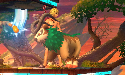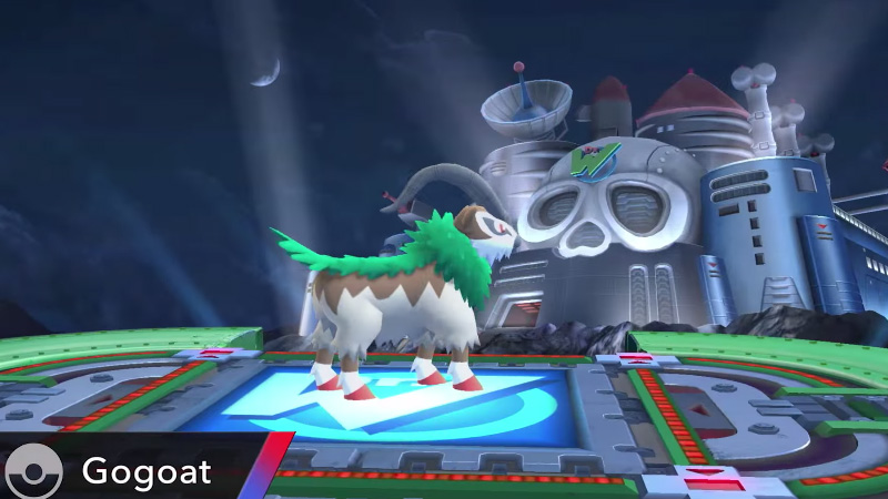 Gogoat is a Grass-type Pokémon that functions a bit differently compared to any other Pokémon in Smash. When Gogoat is released, it runs back and forth and also becomes a moving platform for players to ride while running over other players on the stage.