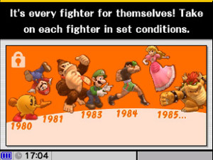 In these battles, multiple opponents appear in one stage, and you clear the battle by defeating a number of them. The rest area that appears between battles displays the next opponents and the year the characters made their first appearances, and it also holds recovery items and an occasional reward. The characters you fight against appear pretty much in chronological order. Behold, the history of Nintendo games!!