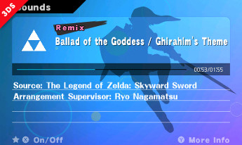 The 3DS version has an excellent Sounds collection! The design looks nice for a sound test screen, doesn't it? The font color for the 'Remix' text on remixed songs comes in pink or white. The pink ones are songs arranged for this version of Super Smash Bros., while the white ones are remixes made in earlier Smash Bros. games. This means there are reoccuring songs from past releases.